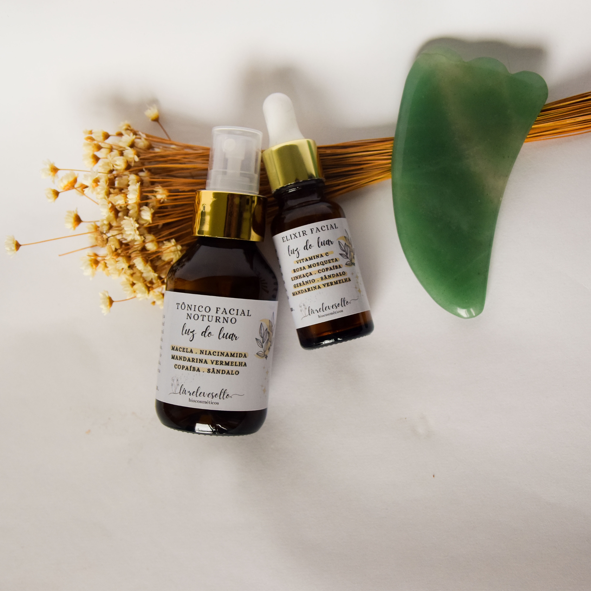 Aproveite o poder combinado do tônico e elixir facial noturno "Luz do Luar" para obter uma pele radiante, uniformizada e iluminada. Desperte emoções de autocuidado e autoamor a cada aplicação, e sinta-se bem com os resultados positivos na sua pele e mente. Cuide-se, nutra-se e brilhe intensamente com esse combo especial.