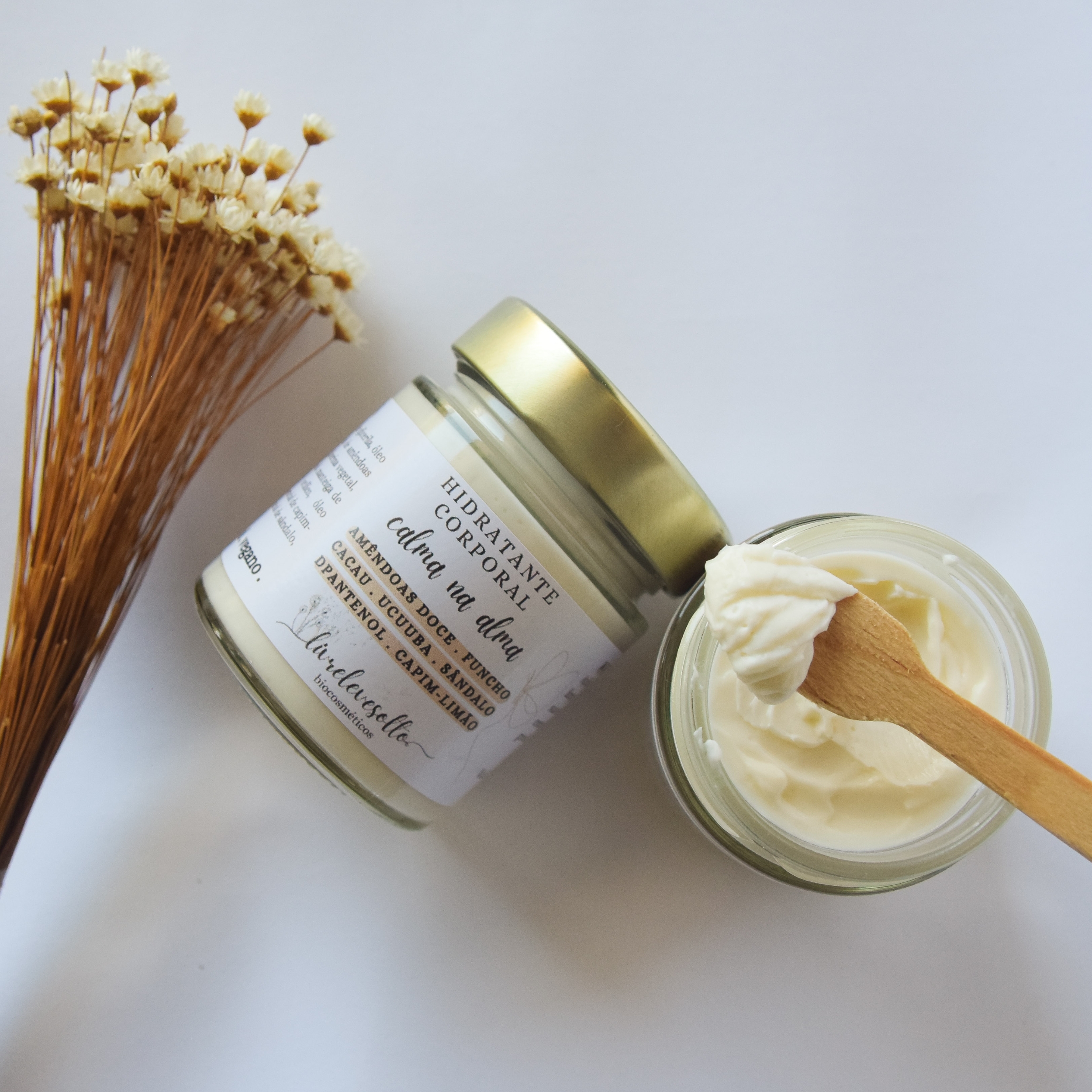 O hidratante corporal "calma na alma" é apresentado em um pote de vidro com tampa em metal, contendo 120 gramas do produto. Para facilitar a aplicação, fornecemos uma pazinha.